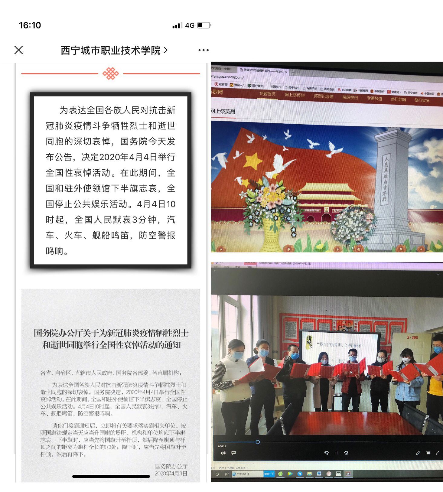 在万物复苏、草木萌发的清明时节,为缅怀革命先烈,继承革命烈士的光荣传统,弘扬疫情抗击中白衣勇士光荣事迹,学院开展了“文明清明”宣传教育活动、“品味清明”节日文化活动、网上祭英烈教育活动。